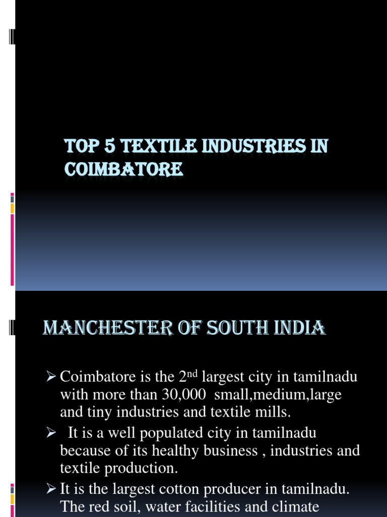 The district also houses the country's largest amount of hosiery and poultry industries. 11 different places of my industrial city was affected but we did not stop our progress. Click here to get an answer to your question manchester of south india. • introduction coimbatore is one of the well developed cities of southern tamil nadu. The nilgiri range surrounds the city in the north and give it a unique and mesmerizing look.